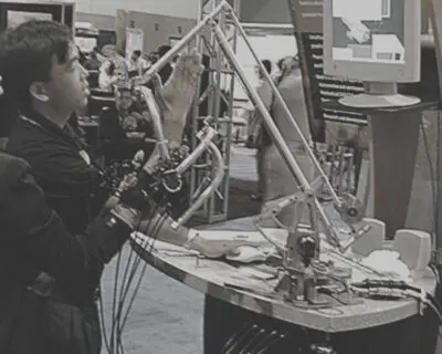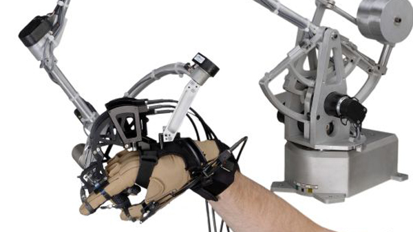 The CyberForce system is an option designed to work with the CyberGrasp exoskeleton, the award-winning, lightweight, force-reflecting system that fits over a CyberGlove data glove and adds resistive force feedback to each finger. The CyberForce system is produced under license from SensAble Technologies, Inc.