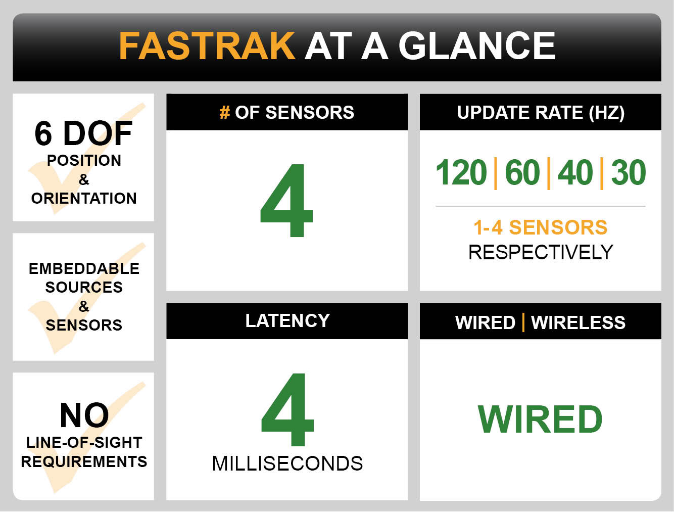 With virtually no latency, FASTRAK® provides real-time data, and updates as fast as 120 Hz. The result is reliable, repeatable results with almost zero lag-time. - Up to Four Sensors